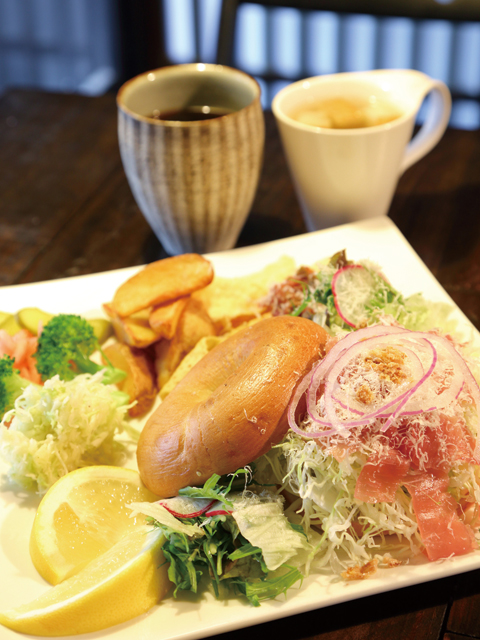 古民家の軒先にたくさんの観葉植物とサボテンが飾られているのが目を引くカフェ。店内にもグリーンがあふれ、レトロな家具との相性はピッタリです。ここの看板メニューは、なんといってもベーグル。エビとアボカドなどの定番のほか、日替わりベーグルサンドもあり、ローカルのファンも飽きさせません。ランチで提供される「ベーグルランチボックスセット」は、選べるベーグルサンドにサラダやチップス、ドリンクがセットになっていてボリュームも十分。地元や近郊の野菜をたっぷり使ったヘルシーさは、女子ランチにおすすめです。