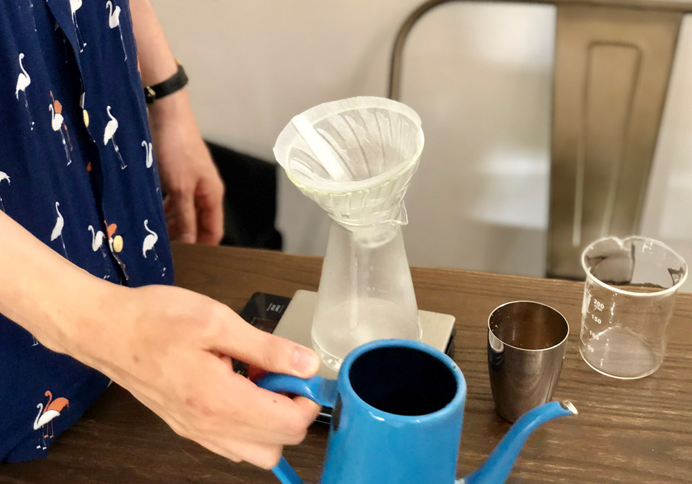 その後、先生がお手本のドリップを実演。最初にペーパーを湯通しすることで紙の味が飛ぶのだそう。