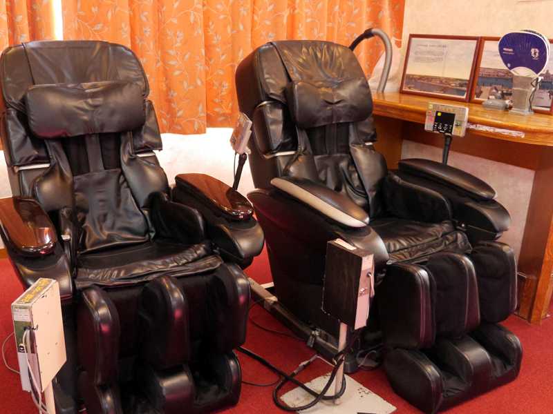 レトロな雰囲気の中、マッサージチェアでリラックス