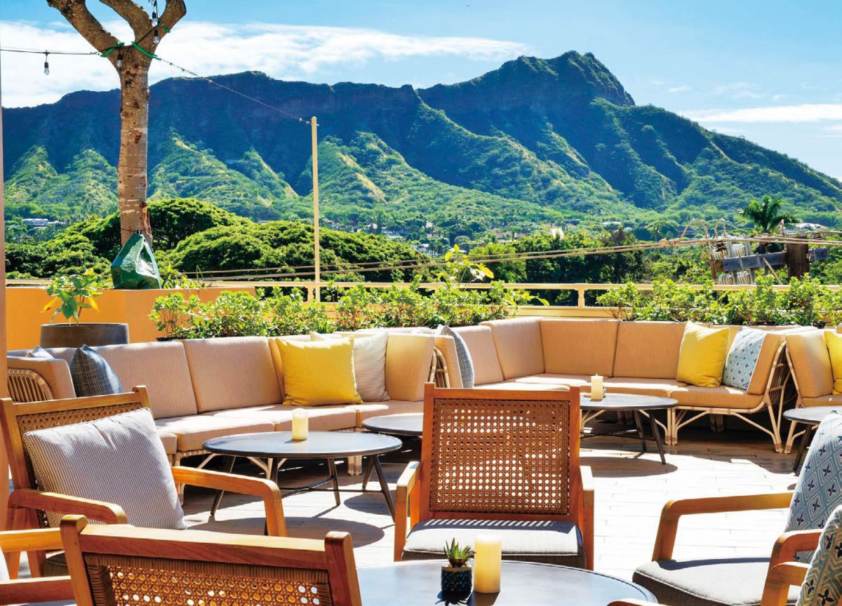 ワイキキの東端に位置し、内装のアートが素敵な「クイーン カピオラニ ホテル」のレストラン。広々としたテラスからは、ダイヤモンドヘッドとワイキキビーチのワイドなビューが楽しめる、なんとも贅沢なダイニングです。