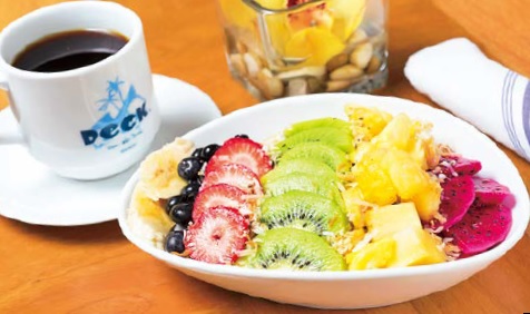 盛り付けもおしゃれなアサイボウルは$15。たっぷりのフルーツが入るヘルシーな一皿を、朝食にいかがですか。新鮮な海鮮などを堪能できる、サンデーブランチのサービスもあります。サンセットや夜景も素敵なので夜の利用もお試しあれ。