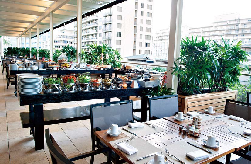ビュッフェでは、オムレツなどのほか、自家製のワッフルにお粥や中華まんなど、多彩な料理が楽しめるのもうれしいポイント!ホテルの6階、プール近くにある店内からは、ワイキキの街を見下ろすことができます。ワイキキビーチも遠くに見えるので探してみて。