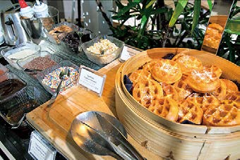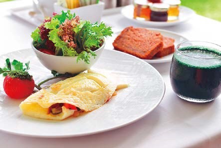 地場食材を中心にした朝食メニューのほか、ヘルシーメニューも用意しています。卵白のベジタブルオムレツを中心とした、ヘルシーなベジタリアンは$39。クラシックワッフル$14はフルーツをトッピングして召し上がれ。