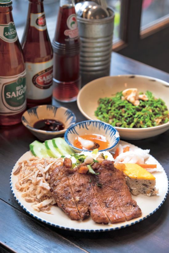 ワンプレートご飯の定番、豚肉の炭火焼をのせた「コム・タム」の専門店。目玉焼きやミンチオムレツなどのトッピングが楽しめて、サイドメニューとして野菜炒めやスープなどもあります。店内にはレンガ調の壁に古写真や絵葉書などが飾られていて、オールドサイゴンの雰囲気が味わえます。