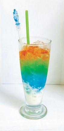 カラフルでかわいいマンゴーなどのシロップを重ねた3色ヨーグルト(2万5000VND)は、ついバイン・ミーと一緒に買いたくなります。