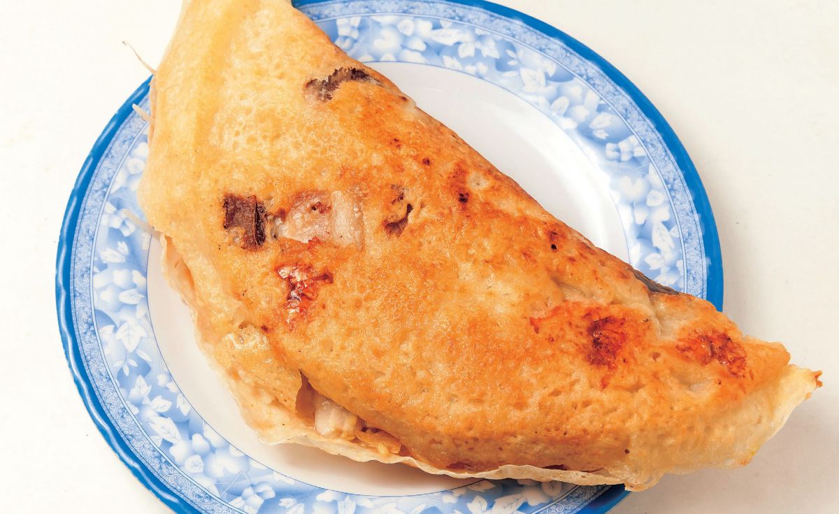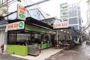 1945年創業の老舗バイン・セオ専門店「バイン・セオ46A」。オリーブオイルを流しかけパリパリに仕上げられたバイン・セオは、直径30cm以上の特大サイズ!ココナッツミルクを混ぜた生地の豊かな風味に、旅行者だけでなく、地元ベトナム人のファンも多いのだとか。