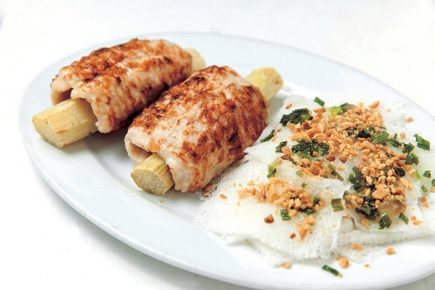 エビのすり身をサトウキビに巻いて焼き上げたちくわ、チャオ・トム(10万VND・2個)は、切り分けて米麺ブンや野菜と一緒に食べます。
