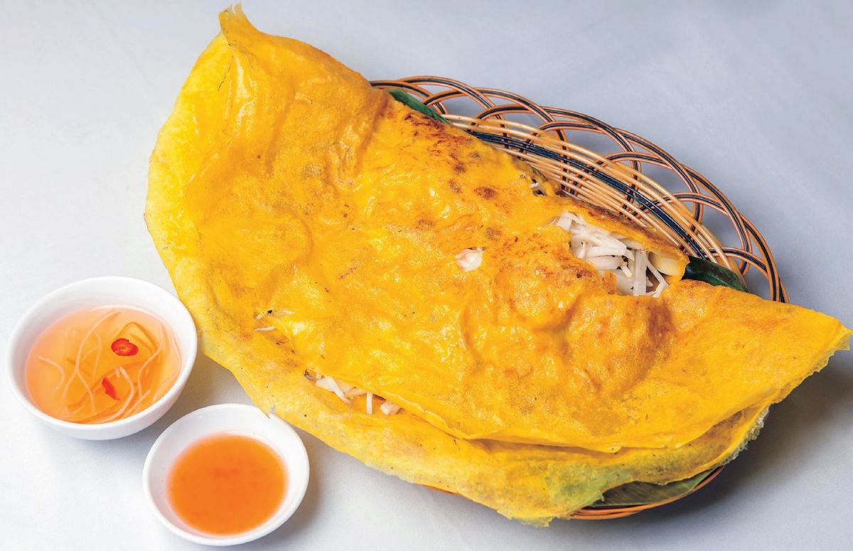 特製バイン・セオ(8万VND)は緑豆やもやしなどの定番具材のほか、海老やイカなどのシーフードがたっぷり。南部メコンデルタらしい甘めのたれが味わい深いです。