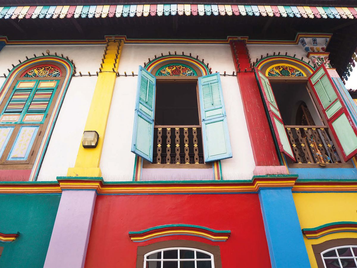 リトル・インディア駅から徒歩3分、カラフルな建物が並ぶリトル・インディアの中でも、特に人気なのがココ!菓子製造業で財を成した中国系実業家が建てた屋敷跡だそうです。色とりどりの窓枠や上階のひさしなどがカワイイです!