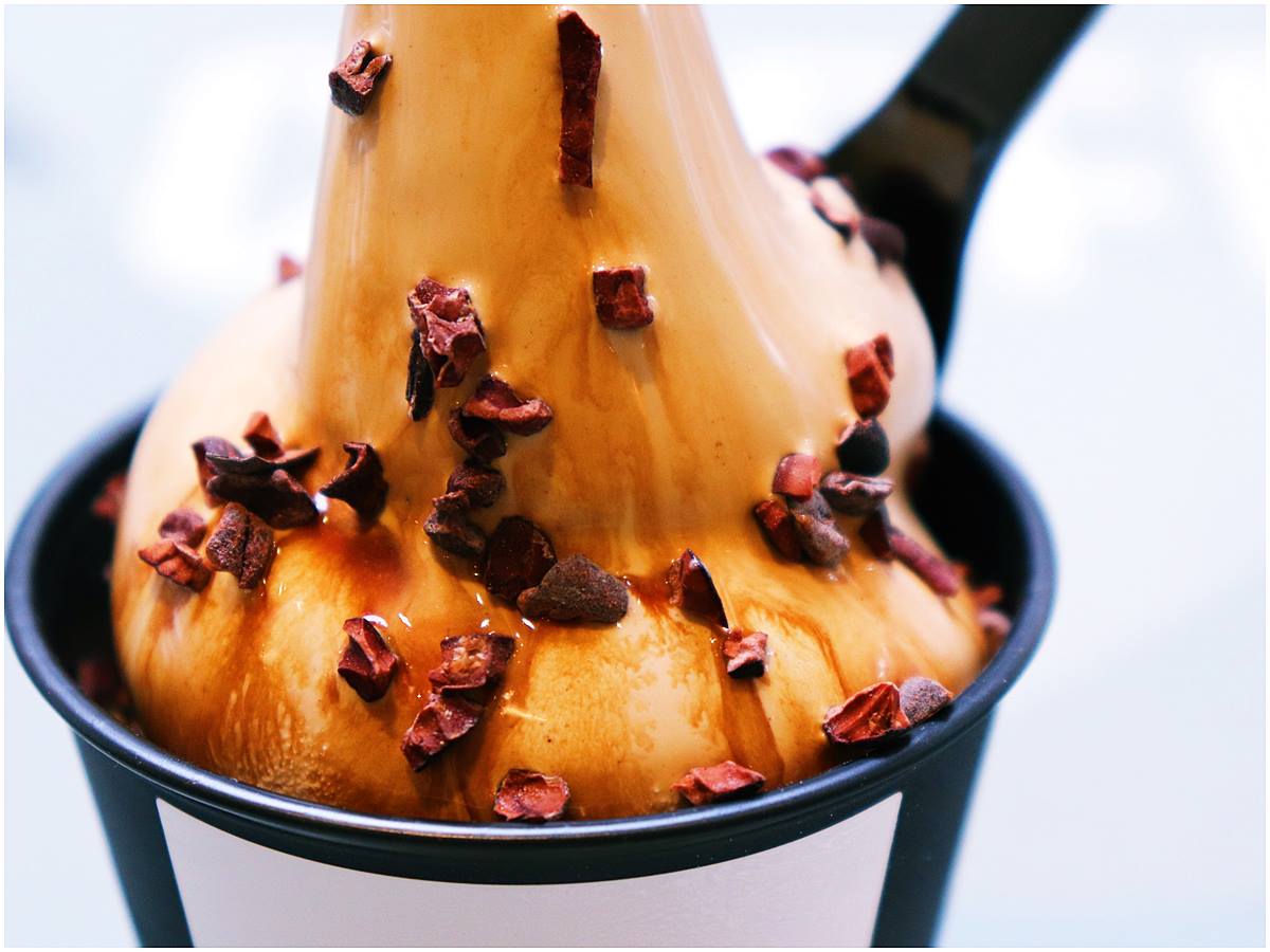 自家焙煎のコーヒーを入れた自家製ソフトクリームにエスプレッソチョコソースとカカオニブがアクセント。