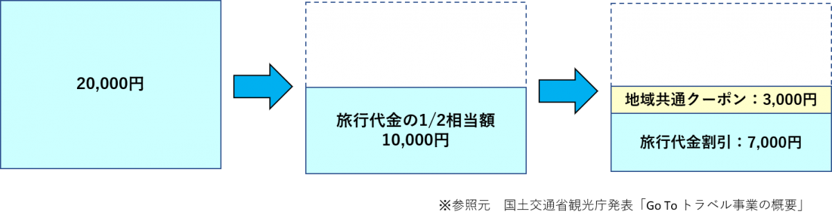 たとえば1人で1泊2万円の旅行代金の場合、旅行代金の1/2相当額10,000円が支援され、そのうち①7割の7,000円が旅行代金の割引に、②3割の3,000円が旅行先で使える地域共通クーポンとして付与される予定です。