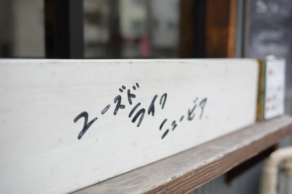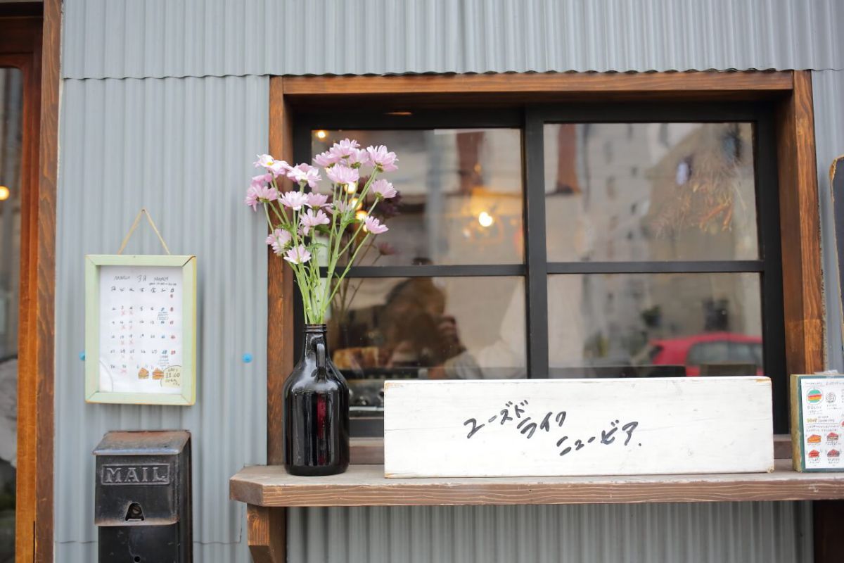手書きでさらっと書かれた看板。このさりげなさがたまりません。店名の「ユーズドライクニュー」とは新古品のこと。「古いものでも僕らにとっては新しい」という思いがこめられています。