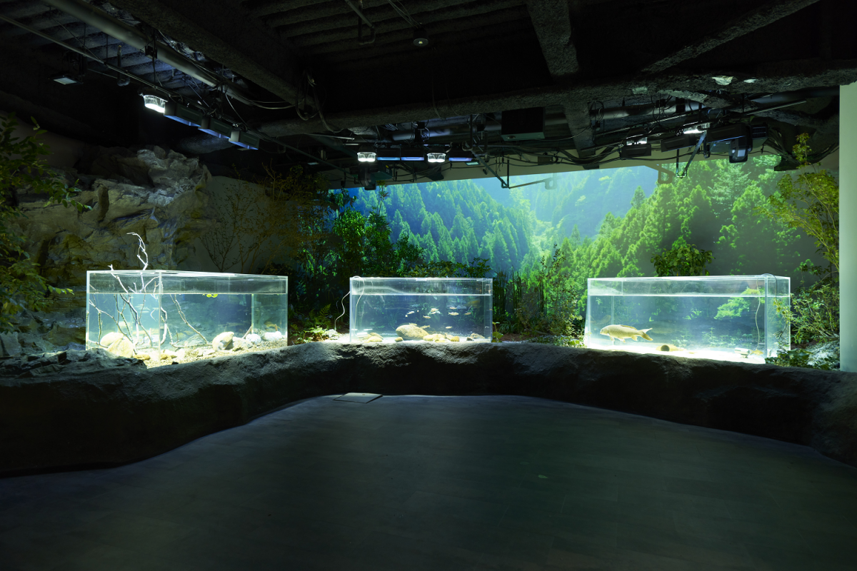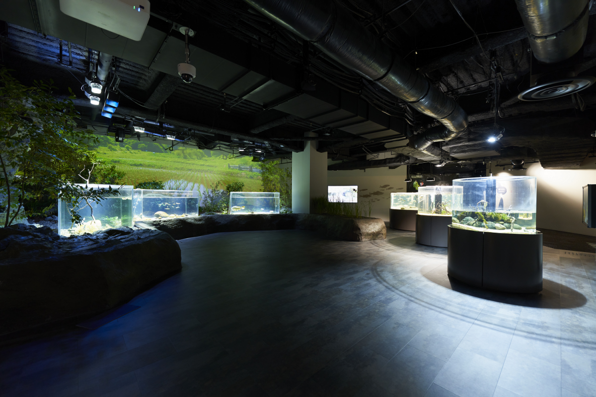旅の始まりは地元・多摩川ゾーンから。ゾーンに入ってすぐ左側に3つ並んだ水槽には、左から右へ上流~下流の生きものを展示していて、それぞれ上流に棲む「アブラハヤ」、中流に棲む「ウグイ」、下流に棲む「コイ」を展示。現在の多摩川の生態系を見ることができます。さらに注目したいのが、水槽のバックに、リアルな多摩川の景色が映し出されていること!朝・昼・夕・夜のそれぞれ異なる時間の多摩川の映像と水槽とのコラボレーションにより、幻想的な雰囲気に包まれます。