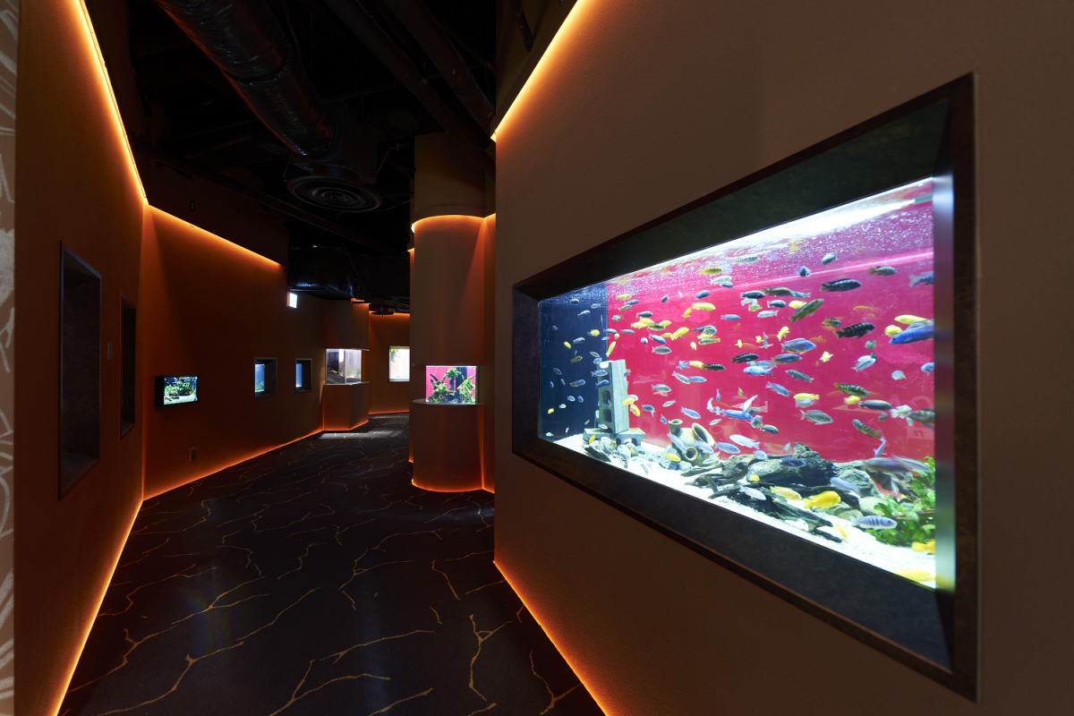 アフリカゾーンはキラキラとカラフルな魚やなんと逆さに泳ぐ魚、水がなくても生きていける魚など、新しい発見が続くゾーンです。また、魚だけではなく、アフリカの水辺近くに棲む、パンサーカメレオンや夜行性の猿ショウガラゴの姿も観察することができます。