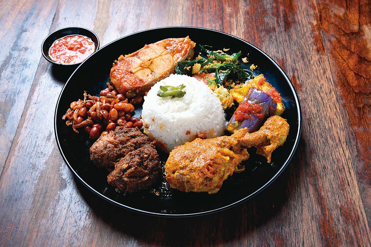 「ワルン・エム・ナシール」は、インドネシア・パダン出身のオーナーが郷土の味を提供する人気の食堂。注文は、人数を伝えて入口のショーケースに並ぶ料理を5~7品ほど選べば、1人前S$10~15の定食が運ばれてくるというシステムになっています。1人だと選んだ料理を写真のように一皿に盛り込んでくれます。