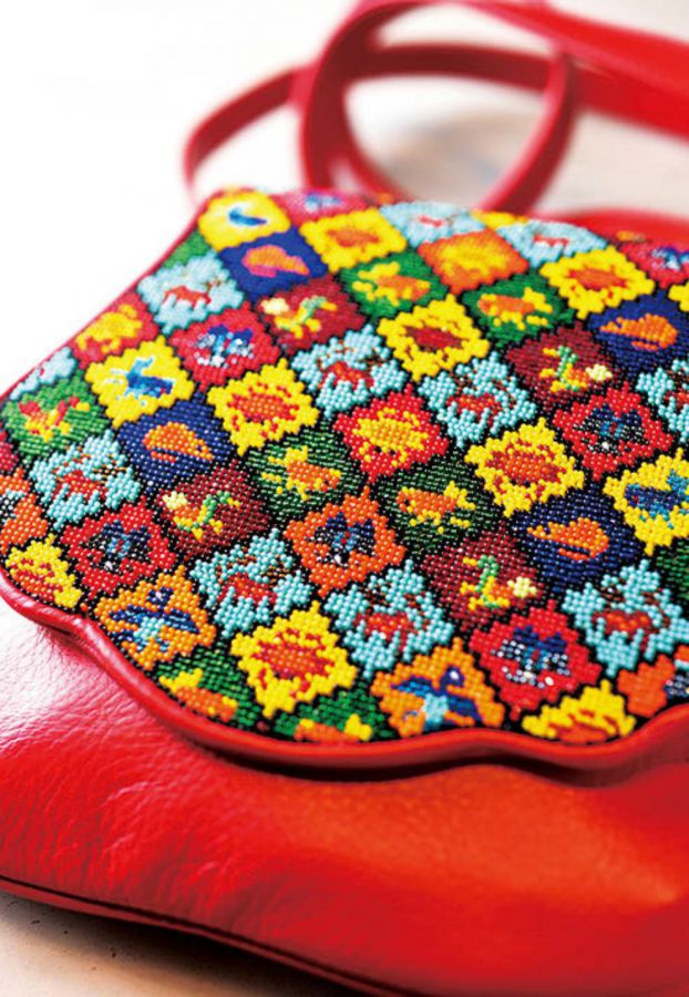 革バッグ(S$450~1800)には、動物などをモチーフにしたとても繊細なビーズ刺繍が!少しフンパツするのも◎。