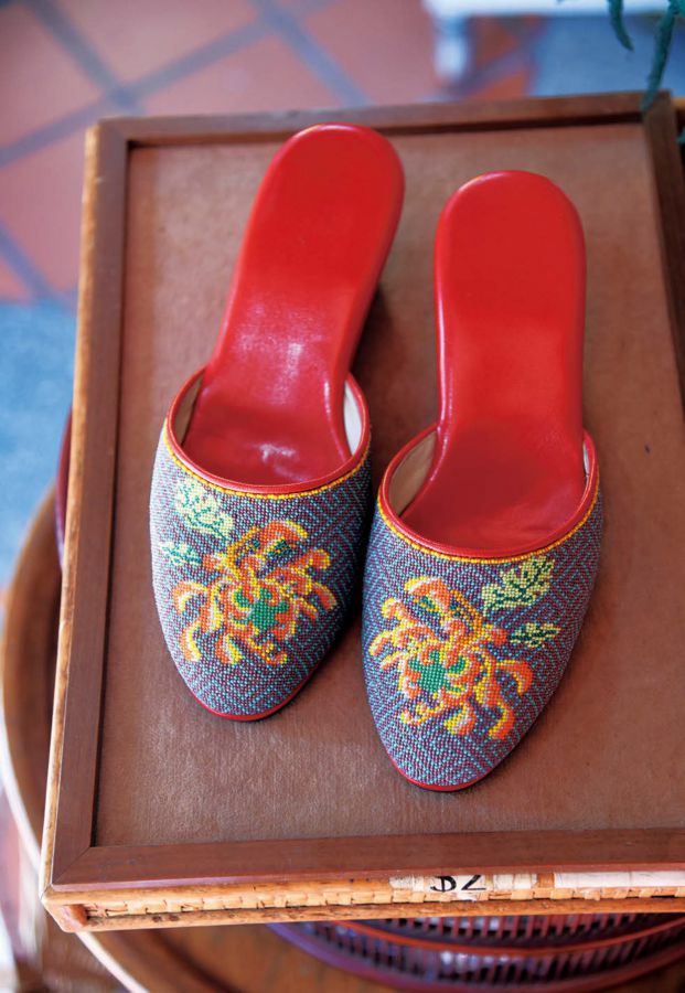 プラナカン料理の名店「トゥルー・ブルー・キュイジーヌ」が手がける専門店「トゥルー・ブルー・ショップ」。陶磁器やビーズのシューズのほか、伝統衣装のケバヤ(約S$150~)も豊富に揃っています。併設のカフェではプラナカンの軽食も楽しめます。写真の、鮮やかなグリーンのサンダル(S$172)は、欧米の影響を受けたモダンなバラ柄。