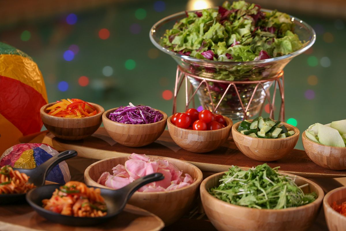 テーブルオーダーできる料理の例は、京都地野菜のサラダバー、カラッと揚げたて鶏もも肉の竜田揚げ、懐かしの厚切りハムカツ、5色あられの衣揚げレンコン餅など。