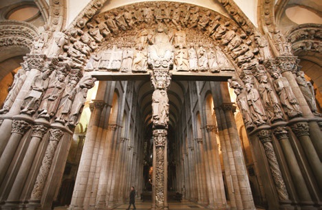 また、聖堂の正面玄関に位置する栄光の門は、ロマネスク美術の最高傑作。ヨハネの黙示録を題材に1188年に彫られた図像建造物で、およそ200以上の彫像が施されています。