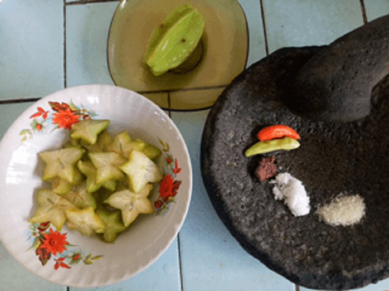 たっぷりの砂糖に、唐辛子などが混ざっており、バリ島の暑さに負けないためにも、水分やビタミンをしっかり摂れる甘辛ティストの味付けになっています。スターフルーツだけでなく、他の果物や野菜を使ってもOK。冷蔵庫にある食材や好み、地方によっても味つけは違うみたい!ピーナッツをすり潰して入れるご家庭もあるようです。