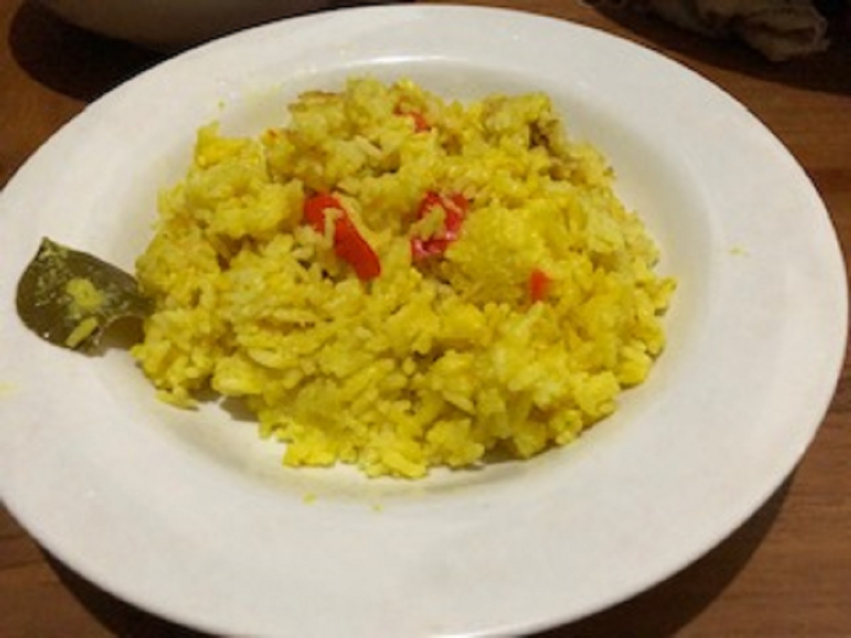 ナシクニンと呼ばれている「黄色いご飯」。白飯のかわりとして普段にも食べられていますが、お祝いごとや神聖な儀式のときには欠かせない、ターメリックライスにひと手間加えたご飯です。