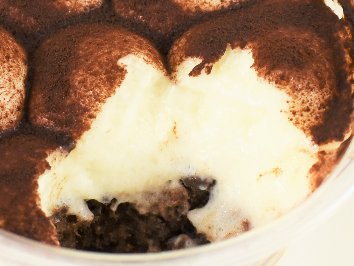ココアパウダーがふりかけられた、モコモコの表面が特徴の「とろけるティラミス」。「見た目以外にはこれといった特徴はないのかな…」と思いきや、モコモコの下には嬉しい秘密が。チョコソース、ティラミスムース、コーヒーシロップの染み込んだスポンジが層になって、しっかりと潜んでいます。1つの容器でバリエーションに富んだ味を楽しめるのは嬉しいポイント。