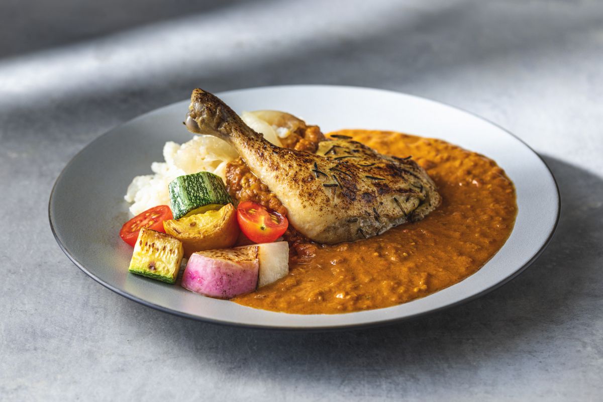 ガッツリ食べたい時には「一晩じっくり煮込んだ若鶏のコンフィ」600円のトッピングもできます。大きな鶏をカレーにど~んとのせて召し上がれ。タマネギや、半熟卵、チーズなどのトッピングもできるのでお好みで。