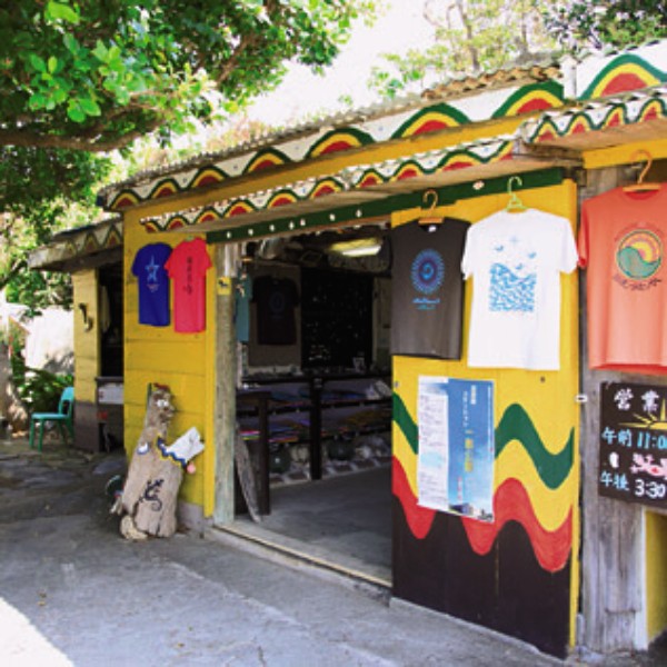 大きなガジュマルの木の下にある、カラフルなペイントが目を引く店構え。南十字星や波といった自然をモチーフにしたオリジナルのTシャツ(2200円~)の他にはオリジナルタオル(600円~)が人気。