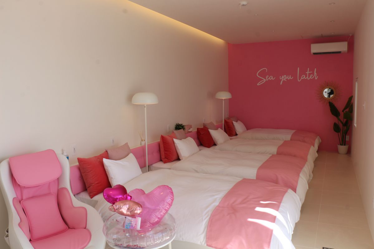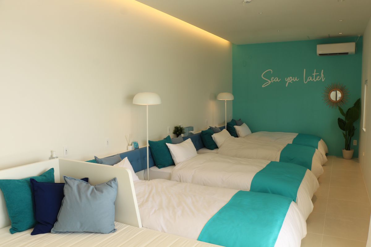 4つのキーカラーで彩られたベッドルームには、4台のシングルベッドが並んでいます。室内には、シャワー&トイレ、冷蔵庫、電子レンジ、エアコン、空気清浄機、ウォーターサーバーを完備。ピンクとイエローの部屋は、定員4名でマッサージチェアがあり、ライトブルーとマリンブルーの部屋にはベッドソファがあり5名まで宿泊可能です。まるでキャンプのように、ファミリーやグループで賑やかに過ごすことができます。