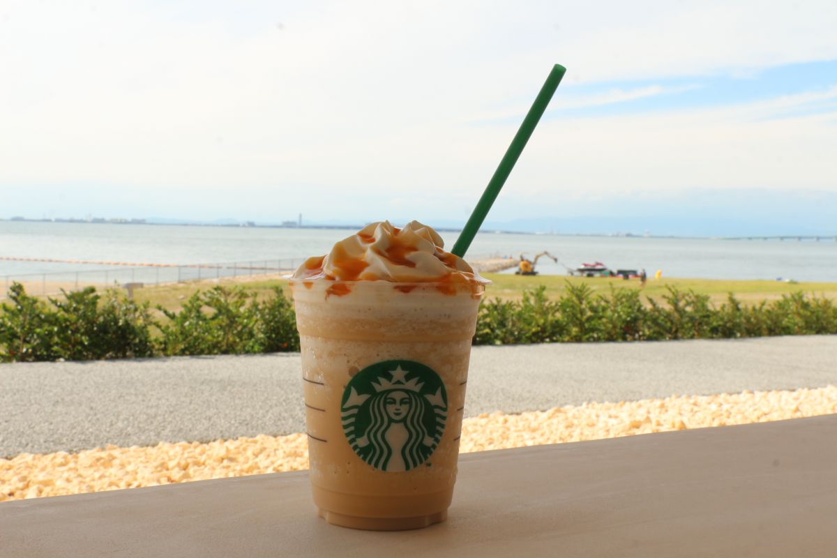コミュニティエリアには、海に面したテラス席が開放的なカフェやレストランがズラリ。大阪府下で3店舗目の公園店舗「スターバックスコーヒー泉南りんくう公園店」。店内の海側は一面のガラスで外の景色が楽しめ、テラス席にも海に向かってベンチが置かれています。