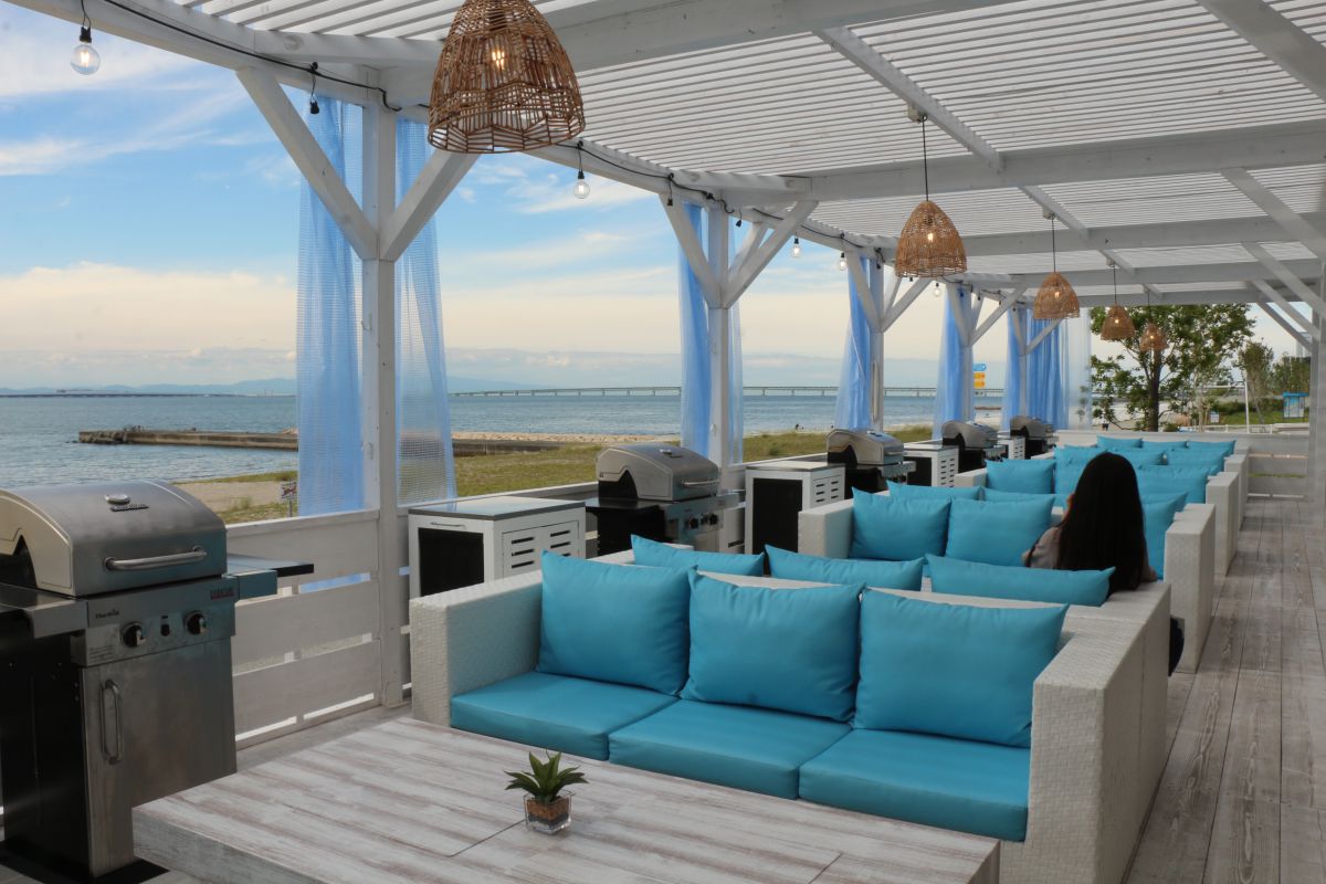 マーブルビーチを臨む「THE BBQ BEACH in Marble Beach(ザバーベキュービーチインマーブルビーチ)」は、全席ソファでゆったりとバーベキューが楽しめます。食材持ち込みプランから食材・飲み放題付きの手ぶらBBQプランまで、ニーズに合わせて利用できます。