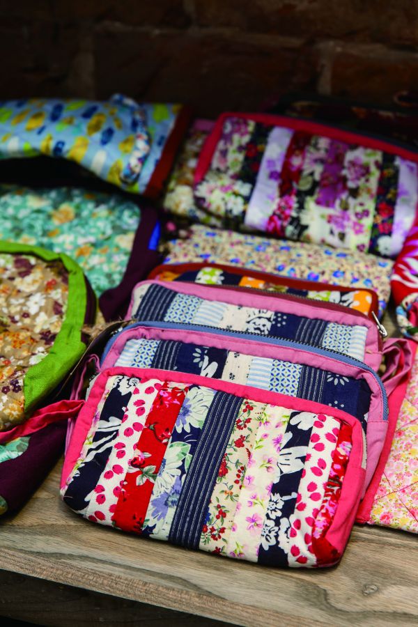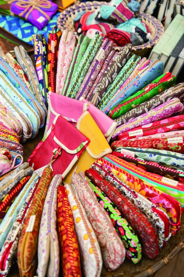 カラフルな布をセンスよく合わせた、パッチワークのポーチがずらりと並びます。17万VND。