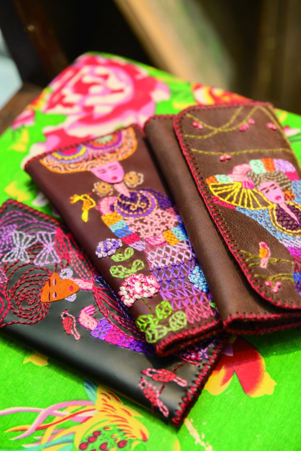 こだわりの詰まった革サイフは300万VND。ベトナムの少数民族を刺繍であしらっています。
