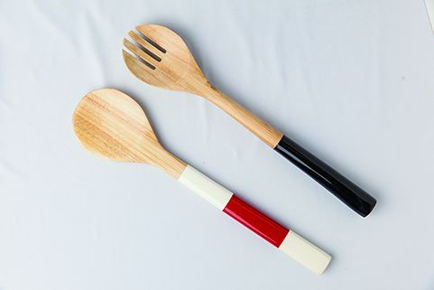 竹と漆を合わせた大型のカトラリーは、大皿料理の取り分け用に◎。サーバーフォーク&スプーンで15万VND。