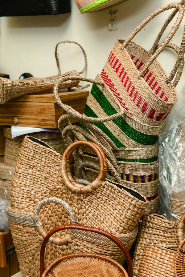 店先にたくさん吊るされた、ゴザカゴやプラカゴが目印のお店「ハー・リエン」。問屋でもある同店の品揃えはとっても豊富!大量買いをすると、海外発送もしてくれます。