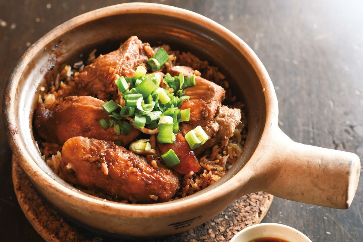 ジューシーなチキンとおこげがおいしい土鍋の炊き込みご飯はクレイ・ポット・チキンライス(S$11)。