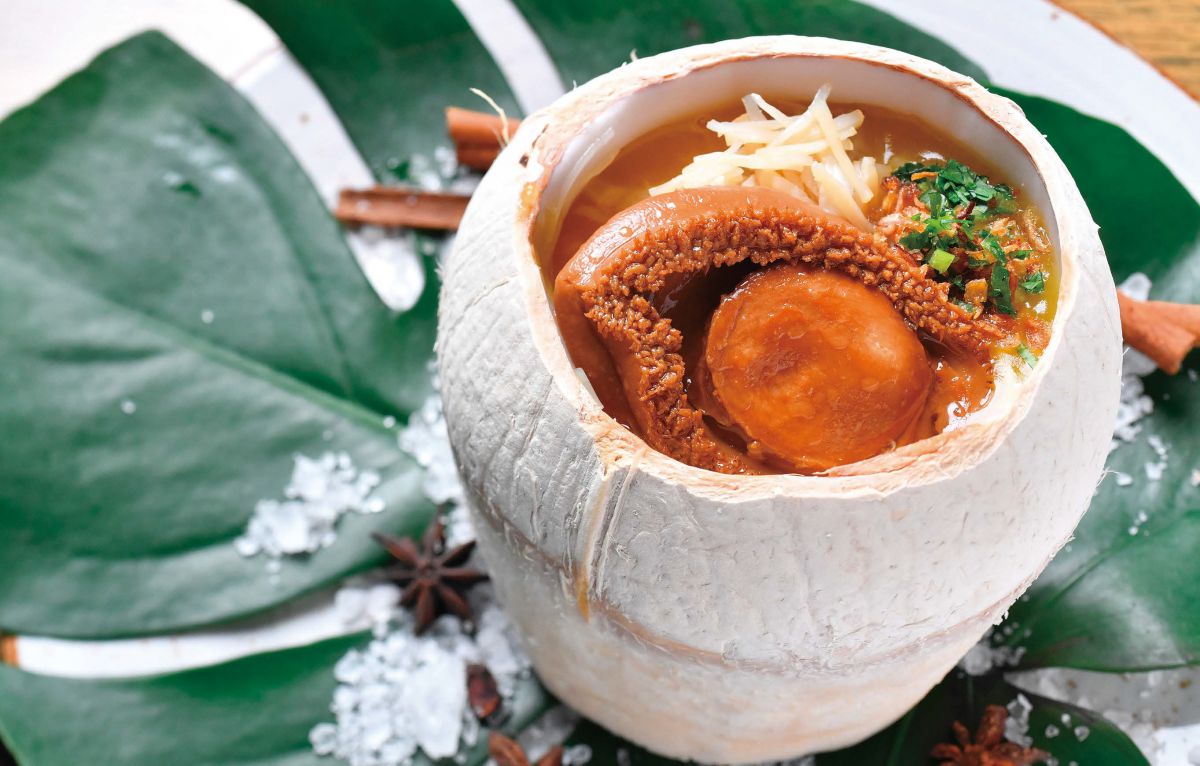 モダン・チャイニーズの旗手として有名なスターシェフのサム・レオン氏が腕を振るう名店。窓ガラス一面に森が広がるダイニングの優雅さと一緒に堪能しましょう。服装はスマートカジュアルで。写真のメニューは、アワビとココナッツという組み合わせが斬新な秘製鮑魚蟹肉面綫(S$46)。