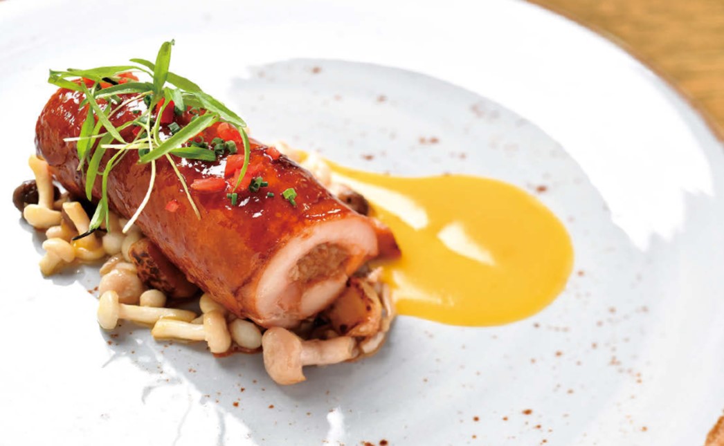 おしゃれに盛り付けられたレモングラス風味のチキンロール香茅糯米鶏巻(S$28)もおすすめの一品です。