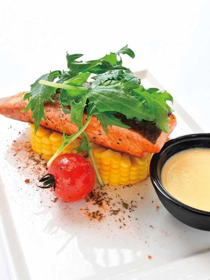 ハードロック・ホテルに隣接する、大きなカジュアル・ダイニングで、シンガポール名物や欧風料理が手軽に味わえる人気店です。お得なセット・ランチ(S$19)も人気です。写真の料理は、サーモンと野菜のグリル(S$28)。新鮮なシーフードとレモンバターソースの組み合わせが爽やか!