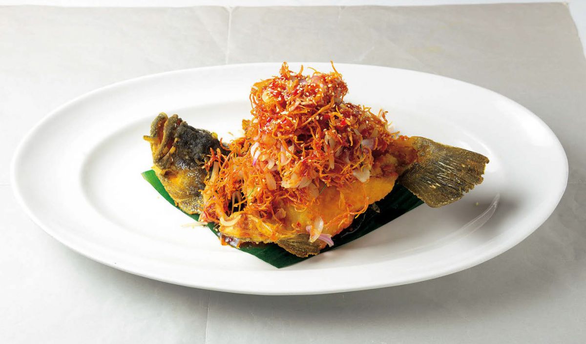 ハニー・タンギー(時価 ※取材時はS$118~128/1kg)は揚げた魚にレモンとハチミツの特製ソースと干しイカ、ゴマがたっぷり載った人気メニュー。