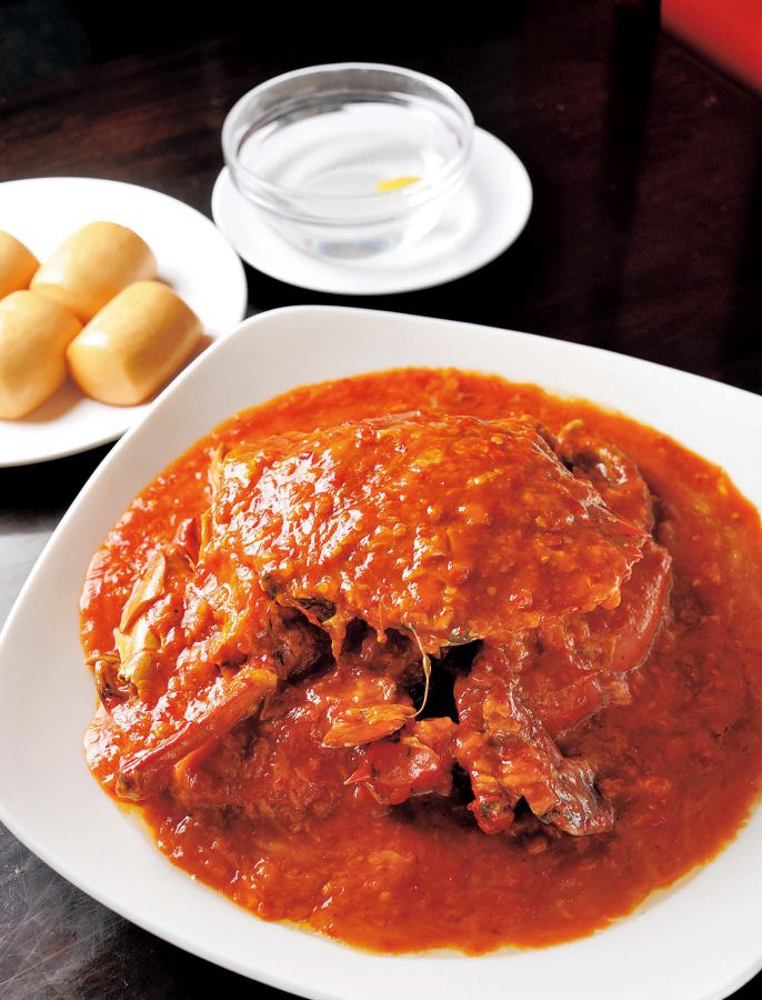 市内に5店舗を展開する「ロングビーチ」の一軒。1946年創業の老舗で、看板メニューのチリクラブだけでなく、ブラクペッパー・クラブ発祥の店でもあります。トマトの酸味と甘さと辛さのバランスがよく、カニの味が引き立つソースが特徴です。写真のチリクラブ(時価 ※取材時はS$88/1㎏)は、生簀で生きていたスリランカ産のカニを調理したもの。