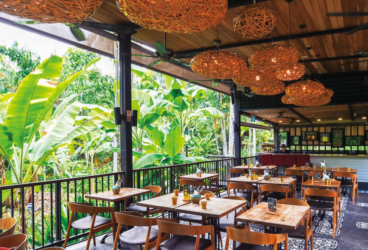 シンガポール植物園内、ジンジャー・ガーデンのすぐそばにある人気の自然カフェ「ハリア」は、広い植物園内の散策中、ひと休みするのにぴったりの空間です。高く生い茂る植物に囲まれたテラス席は自然の中にいる気分を存分に味わえます。