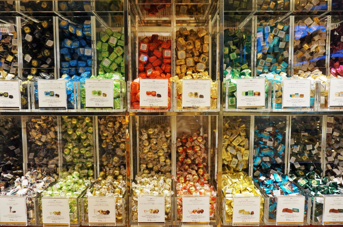 量り売りのカラフルなチョコレート32種類、チョコレートバー22種類、そのほかプラリネ12種類、ギフトセット20種類など、合計90種類以上のチョコレートを取りそろえています。