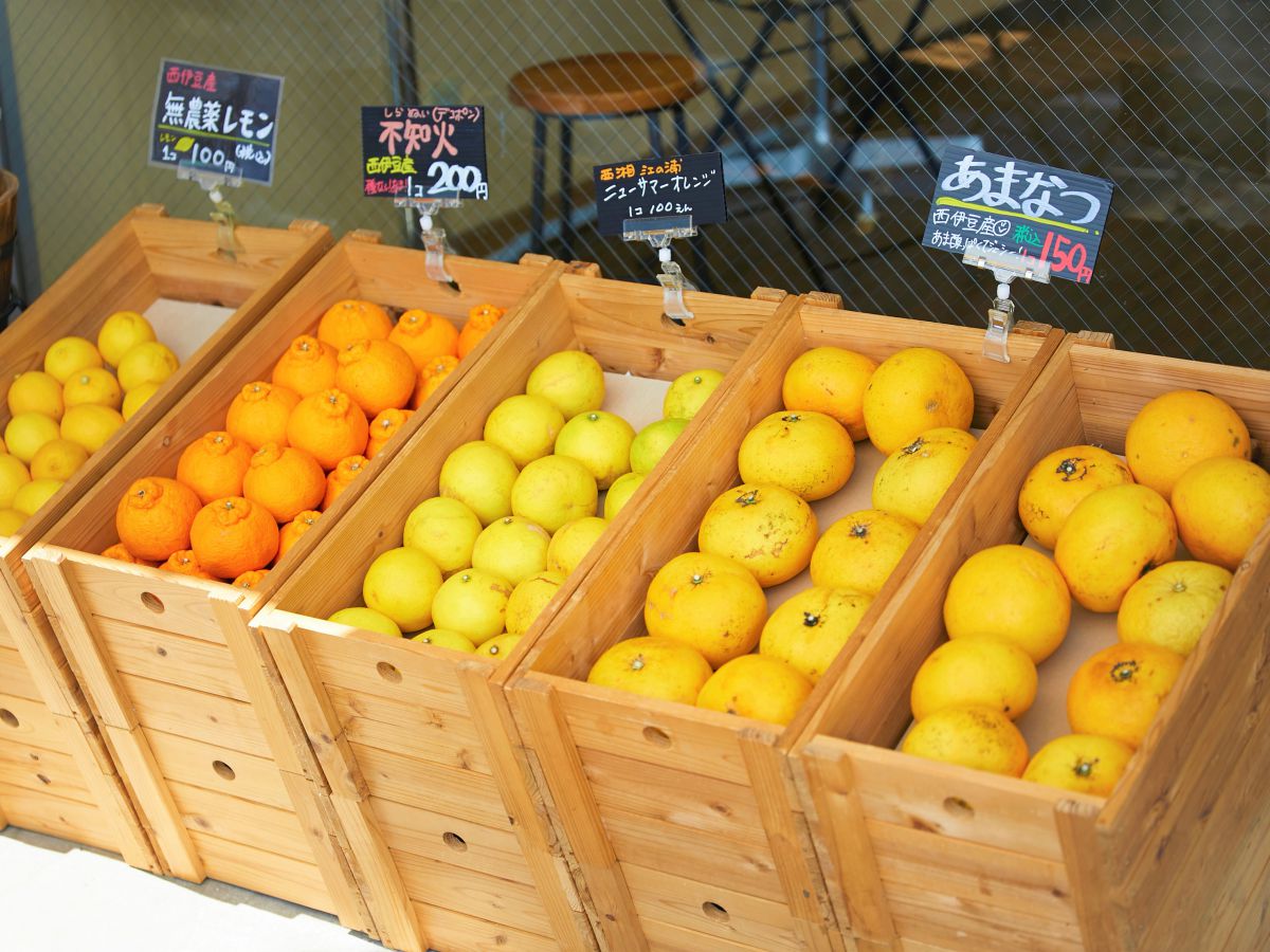 「柑熟屋」を訪れるお客さんの大半は、スイーツと一緒に新鮮な柑橘を購入していくそうです。シーズンを問わず、店頭に並ぶミカンは5~6種。