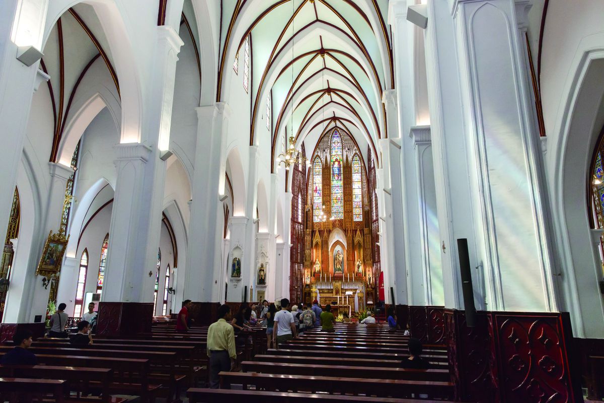 続いて訪れたい「ハノイ大教会」は、水上人形劇場から徒歩15分ほどの位置にあります。仏領時代の1868年、仏教寺院の跡地に建設され、その後、現在のネオ・ゴシック様式に改築された教会です。広場の正面には、街を見守るように聖母マリア像が鎮座しています。