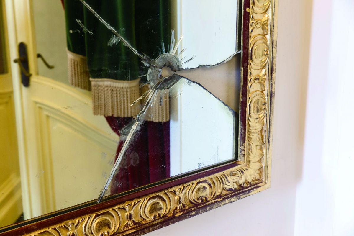 鏡の間には、戦争中の銃弾跡が残る鏡も残っています。