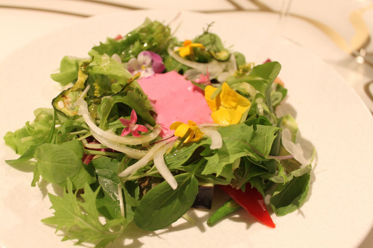 シャキシャキとした食感の旬の野菜やカラフルなエディブルフラワーの中に、シャンパンと相性バツグンのオマールエビやキャビアなどをしのばせた「菜園」。