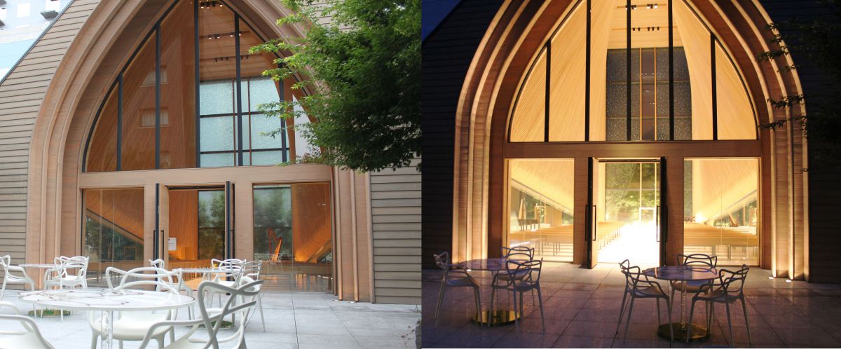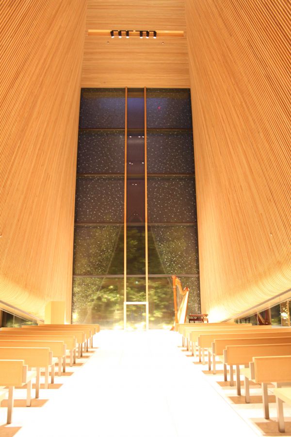 やわらかな木の香りに包まれたチャペル内で、シャンパーニュをいただくのもオススメです(※ドリンクのみ可)。