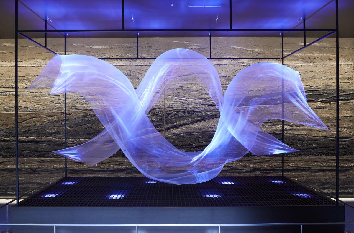 「wind_form」は、6台のファンを使って下から風を当てることで、ゆっくりと姿を変えてゆく美しいオーガンジーの布。ホテルの象徴的な存在として親しまれるアートピースは、昼と夜とでまた違った表情を見せてくれます。