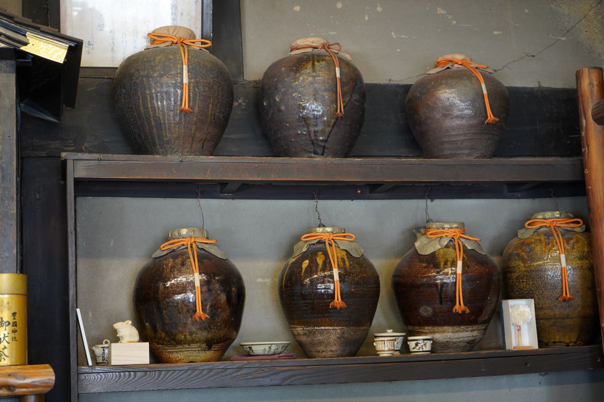 店内にも歴史を伝えるものがたくさん。茶箱が登場するよりも前に使われていた茶壺。数百年の時を経て、その姿を留めます。